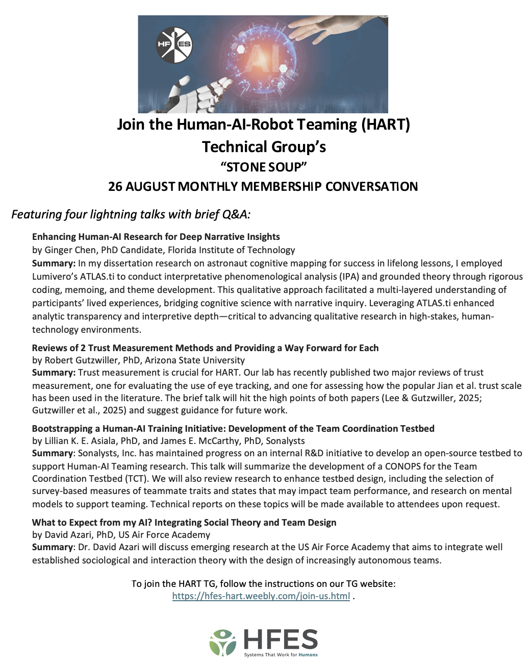 Announcing the first annual "Stone Soup" Meeting of the HFES Human-AI-Robot Teaming (HART) Technical Group. We're excited about the scientists who've volunteered to share their work as a part of this 1-hour informal community event. Each will give a brief lightening talk and then take questions for the remainder of their time. We invite interested non-members to join us for this one.
