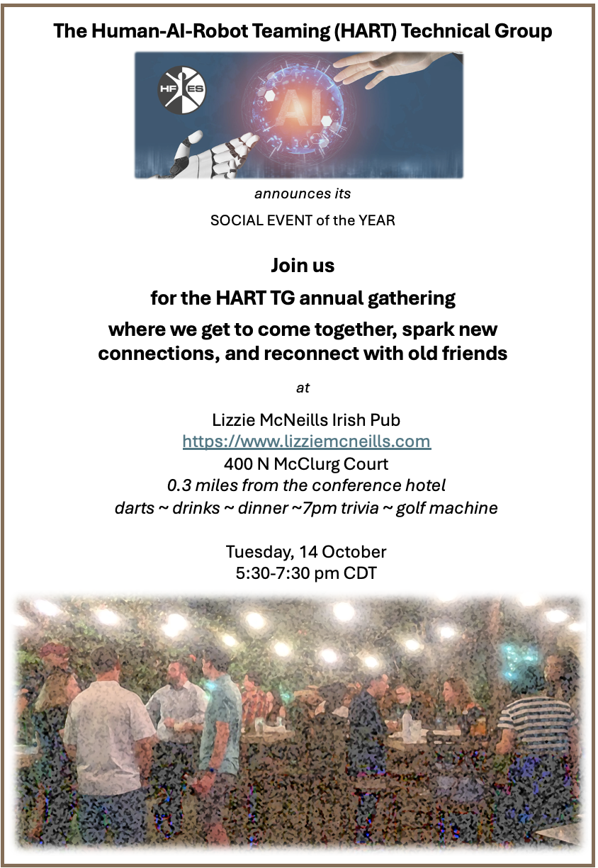 Hi Everyone, please come out for our HART TG social. Membership is not required, so please feel free to bring/invite others. We'll be at Lizzie McNeill's for drinks and/or dinner starting at 5:30--just 0.3 miles from the hotel.